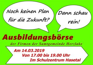 Ausbildungsbörse am Donnerstag, 14.03.2019, 17:00 Uhr – 19:00 Uhr am Schulzentrum Hasetal Eine gute Ausbildung ist entscheidend für den Berufseinstieg....